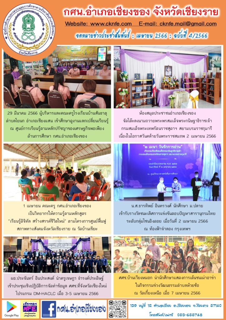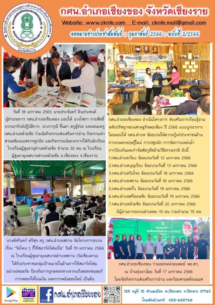 สำนักงาน กศน.จังหวัดเชียงราย เป็นเจ้าภาพจัดการแข่งขันกีฬาโซนอิงดอย 2566 ประกอบด้วย กศน.จังหวัดเชียงราย, กศน.จังหวัดพะเยา, กศน.จังหวัดแพร่ และ กศน.จังหวัดน่าน เพื่อคัดเลือกตัวแทนนักกีฬาเข้าแข่งขันในระดับภาคเหนือต่อไป เมื่อวันที่ 10-11 มกราคม 2566 ณ สนามกีฬากลางจังหวัดเชียงราย