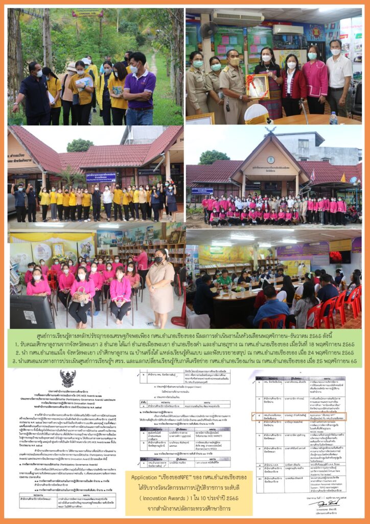 นายประจันทร์ อินประสงค์ มอบหมายให้ครูเจษฎา ธำรงค์ประดิษฐ์ เป็นตัวแทน กศน.อำเภอเชียงของ รับรางวัลนวัตกรรมการปฏิบัติราชการระดับดี OPS MOE Award ประจำปี 2565 จากปลัดกระทรวงศึกษาธิการ ท่านอรรถพล สังขวาสี 1 ใน 19 รางวัล (1ใน4 สถานศึกษา กศน) จากผลงาน Application “เชียงของNFE” เรียนรู้ออนไลน์กับ กศน.อำเภอเชียงของ เมื่อวันที่ 12 มกราคม 2566 ณ กระทรวงศึกษาธิการ